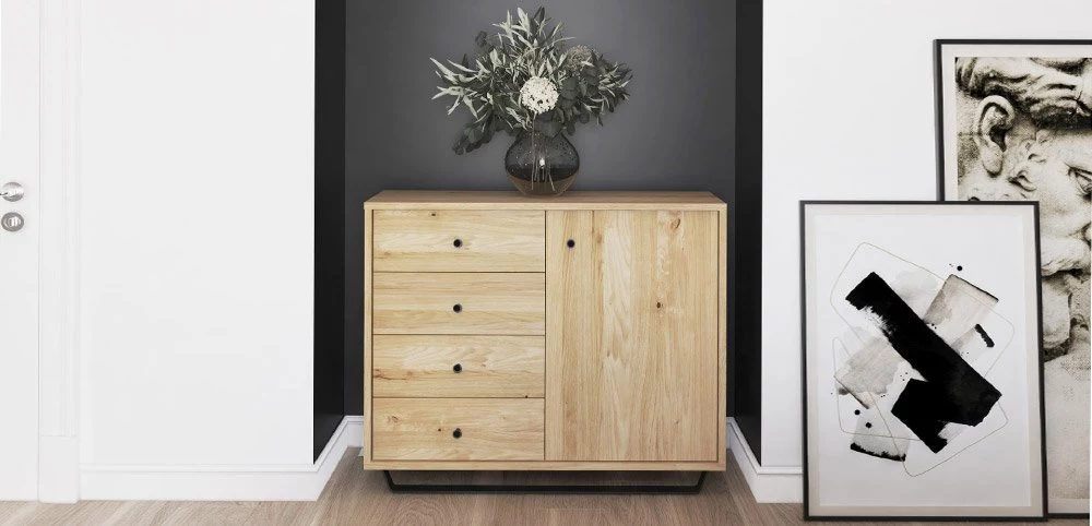 Dubový nábytok na kovových nožičkách sa bude vynikajúco prezentovať aj v obývacích izbách, kde sa dá majstrovsky usporiadať s konferenčnými stolíkmi a stolmi, ktoré taktiež nájdete v našej širokej ponuke. Pri použití tejto kombinácie budú miestnosti tvoriť súvislý celok. Moderná dubová spálňa zariadená nábytkom z kolekcie Steel vytvorí oázu pokoja, v ktorej Vám vôňa dreva bude pripomínať letné prechádzky v šumiacom dubovom lese.